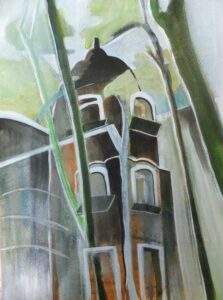 6 POORT NAAR DE STAD Acryl, gemengde techniek op karton in aluminium lijst met passe partout van 55 bij 75