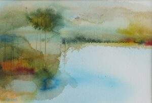25 BOMEN AAN HET MEER Acryl op papier in zilverkleurige aluminium lijst van 40 bij 50 met passe partout