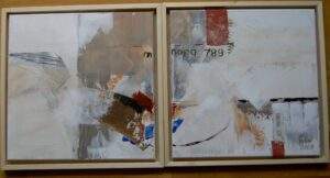 10 MORGENSTOND -TWEELUIK Acryl,collage,gemengde techniek op 2 doeken van 30 bij 30