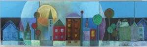 66 STAD IN DE SCHEMERING acryl op karton in zwart houten lijst van 52 bij 72 met passe partout