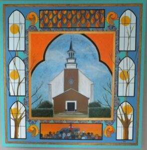 15A Huis met 3 ramen. Acryl op karton in aluminium lijst met passe partout 60x40,5